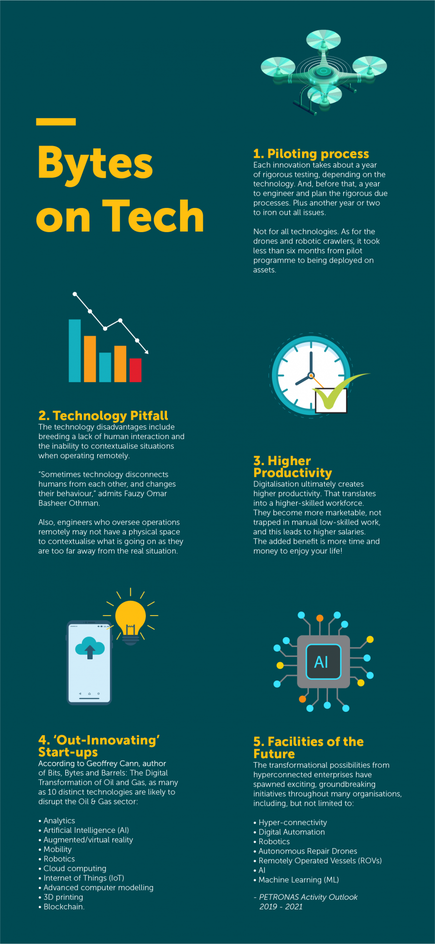 Similarly, as volatility in the sector continues, PETRONAS confronts growing disruption and transitioning challenges through technology. Its Facilities of the Future (FoF) programme, under the purview of Group Research & Technology (GR&T), aims to seek methods to deploy technology - digital, data analytics, automation, and robotic solutions - to its assets.