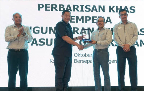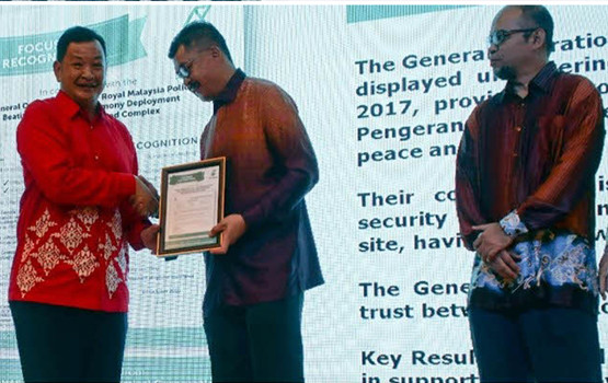 IGP Tan Sri Dato Seri Abdul Hamid Bador received a Focused Recognition from En Farid Yaacob, Head of Manufacturing and Engineering, (left) and presented a token of appreciation in return.