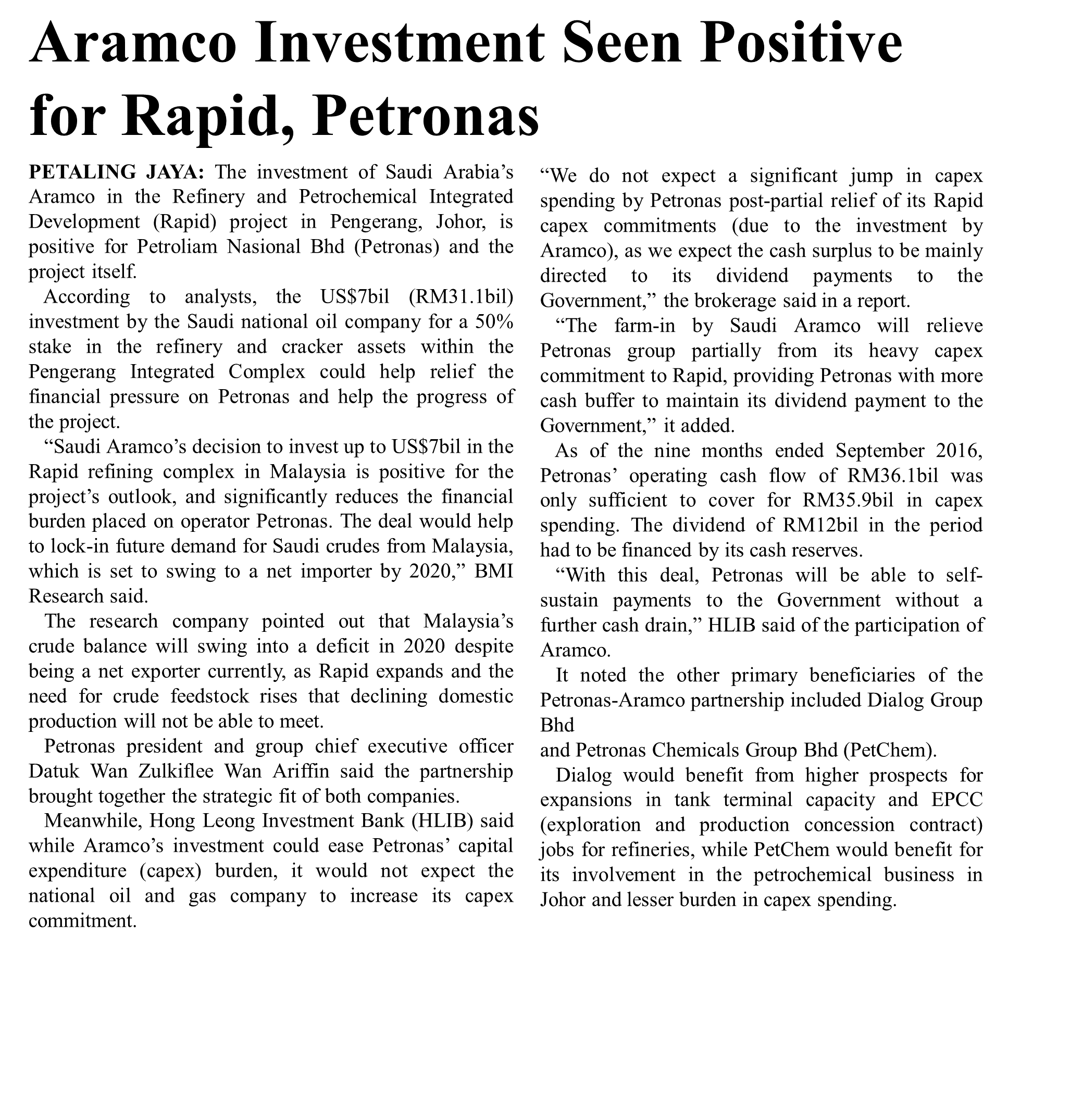 Aramco Investment Seen Positive for RAPID, PETRONAS2 · Mar · 2017 - The Star