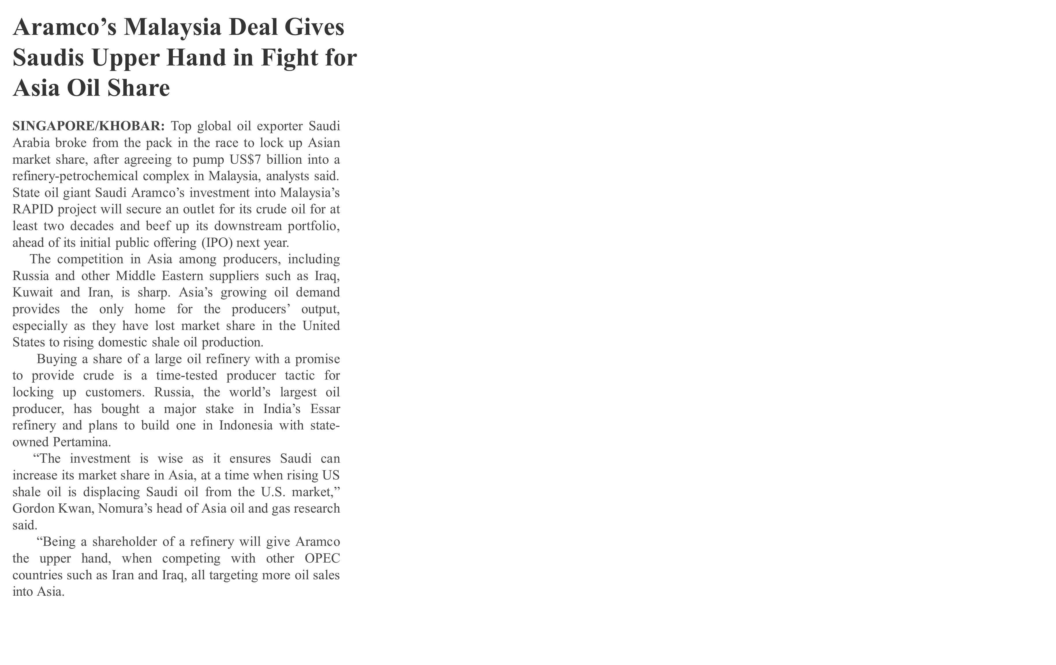 Aramco's Malaysia Deal Gives Saudis Upper Hand in Fight for Asia Oil Share2 · Mar · 2017 - Borneo Post