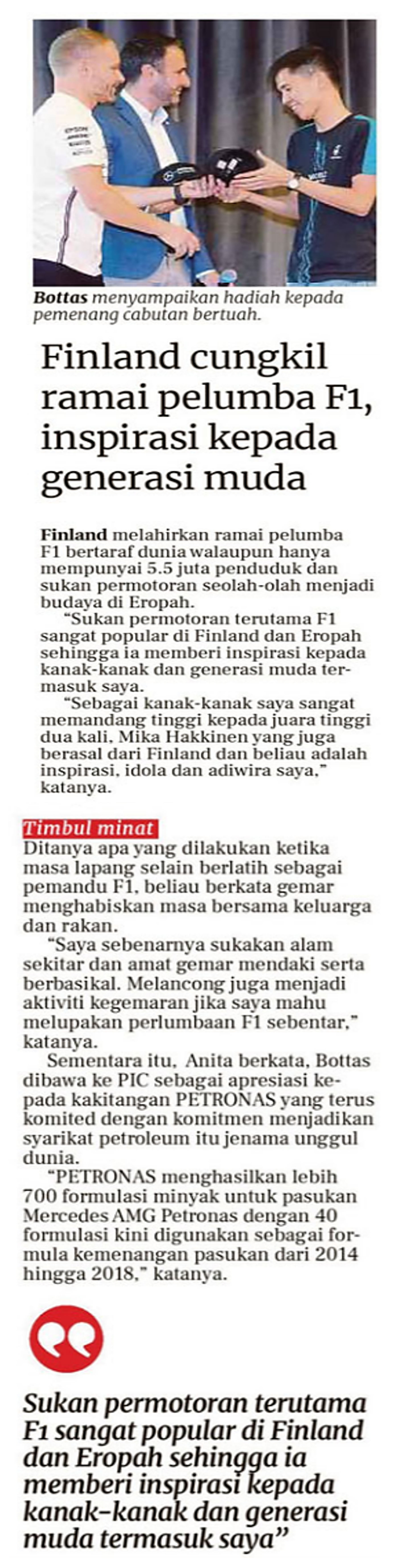 Finland Cungkil Ramai Pelumba F1, Inpirasi kepada Generasi Muda