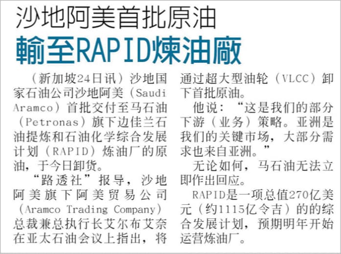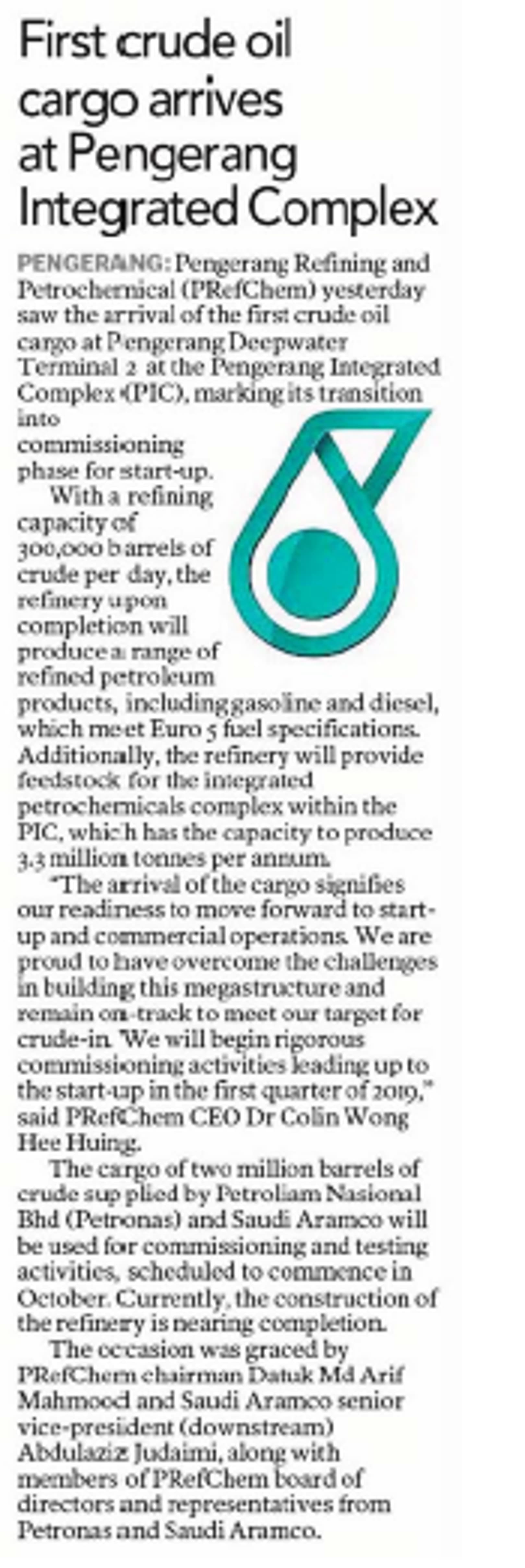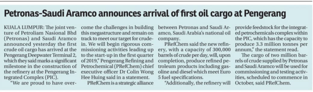 Petronas-Saudi Aramco Announces Arrival of First Cargo at Pengerang