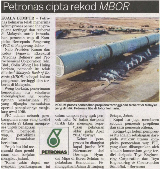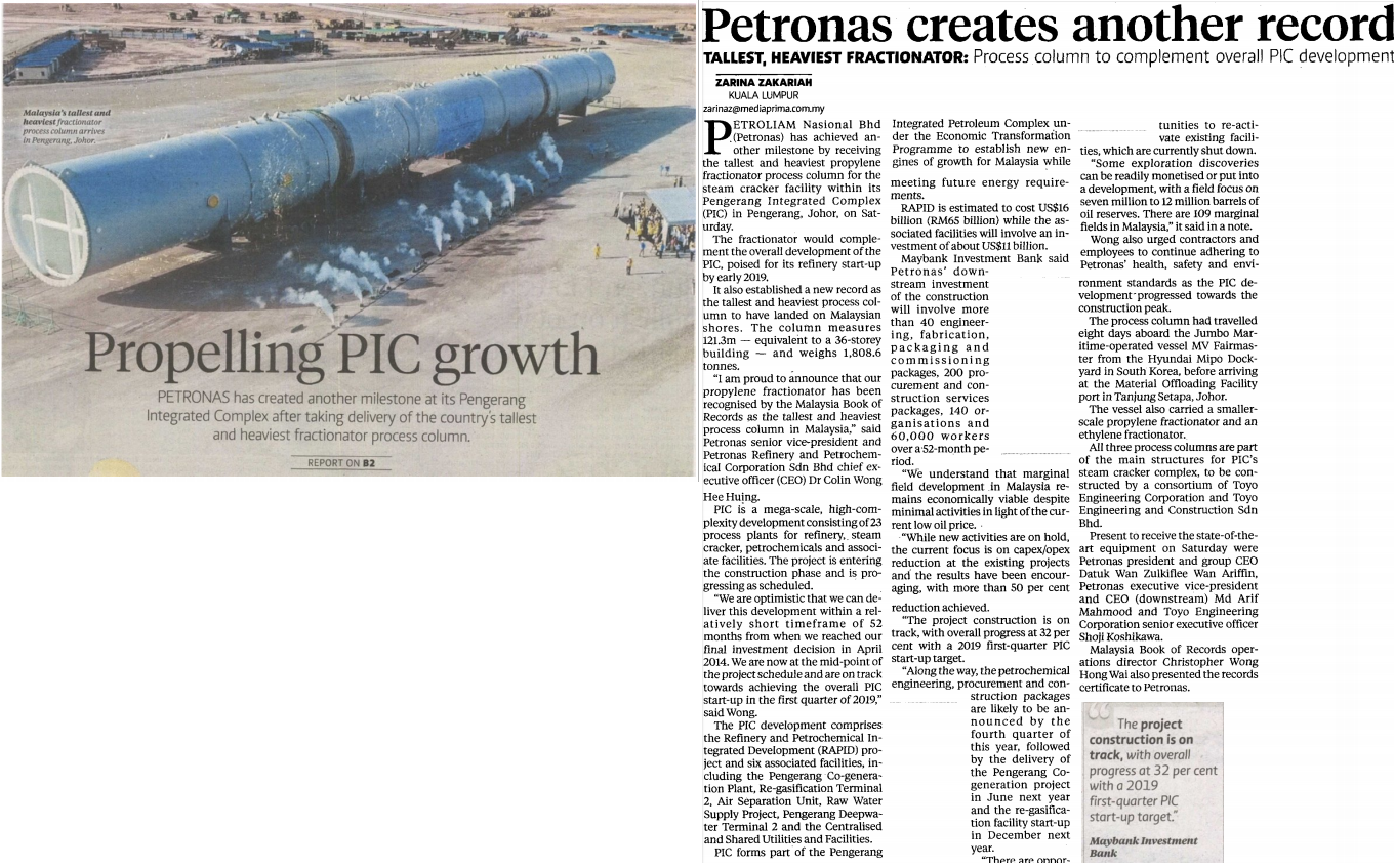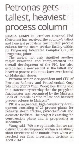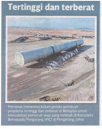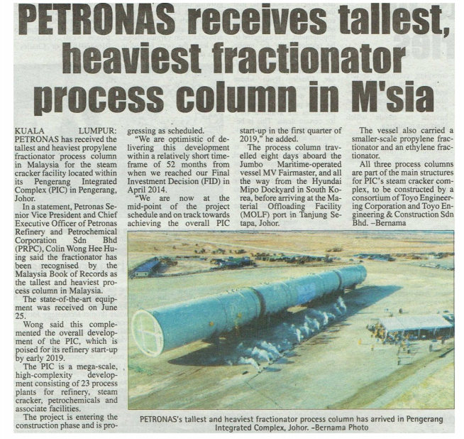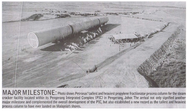 PETRONAS Receives Tallest, Heaviest Fractionator Process Column in M'sia