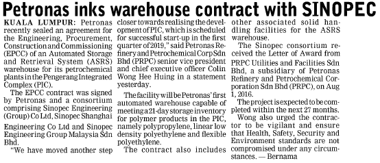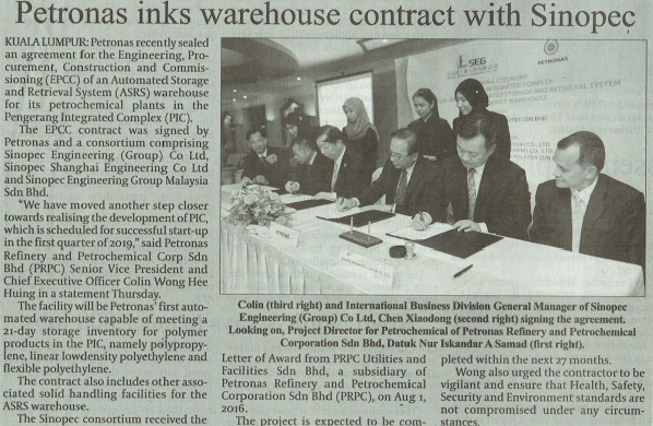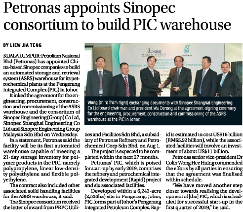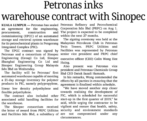 PETRONAS Appoints Sinopec Consortium to Build PIC Warehouse