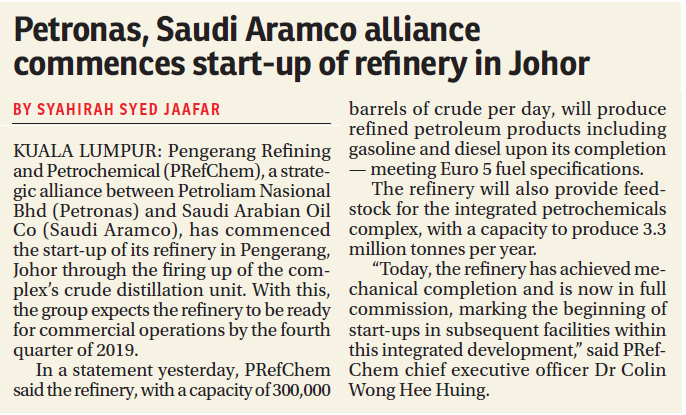 PETRONAS, Saudi Aramco Alliance Commences Start-up of Refinery in Johor23 · Jan · 2019 - The Edge Financial Daily