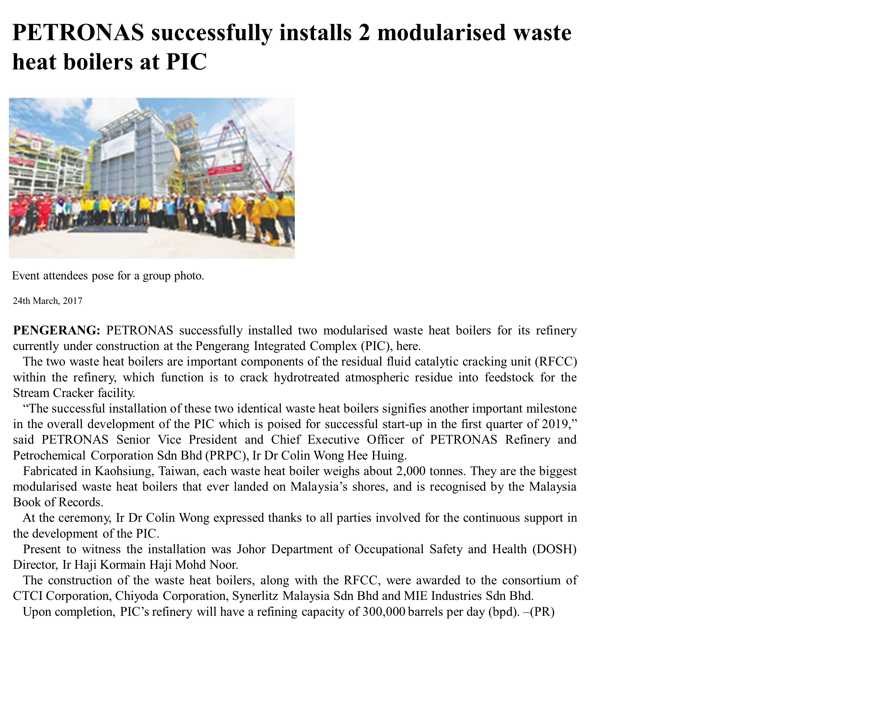 PETRONAS Successfully Installs 2 Modularised Waste Heat Boilers at PIC24 · Mar · 2017 - New Sabah Times English