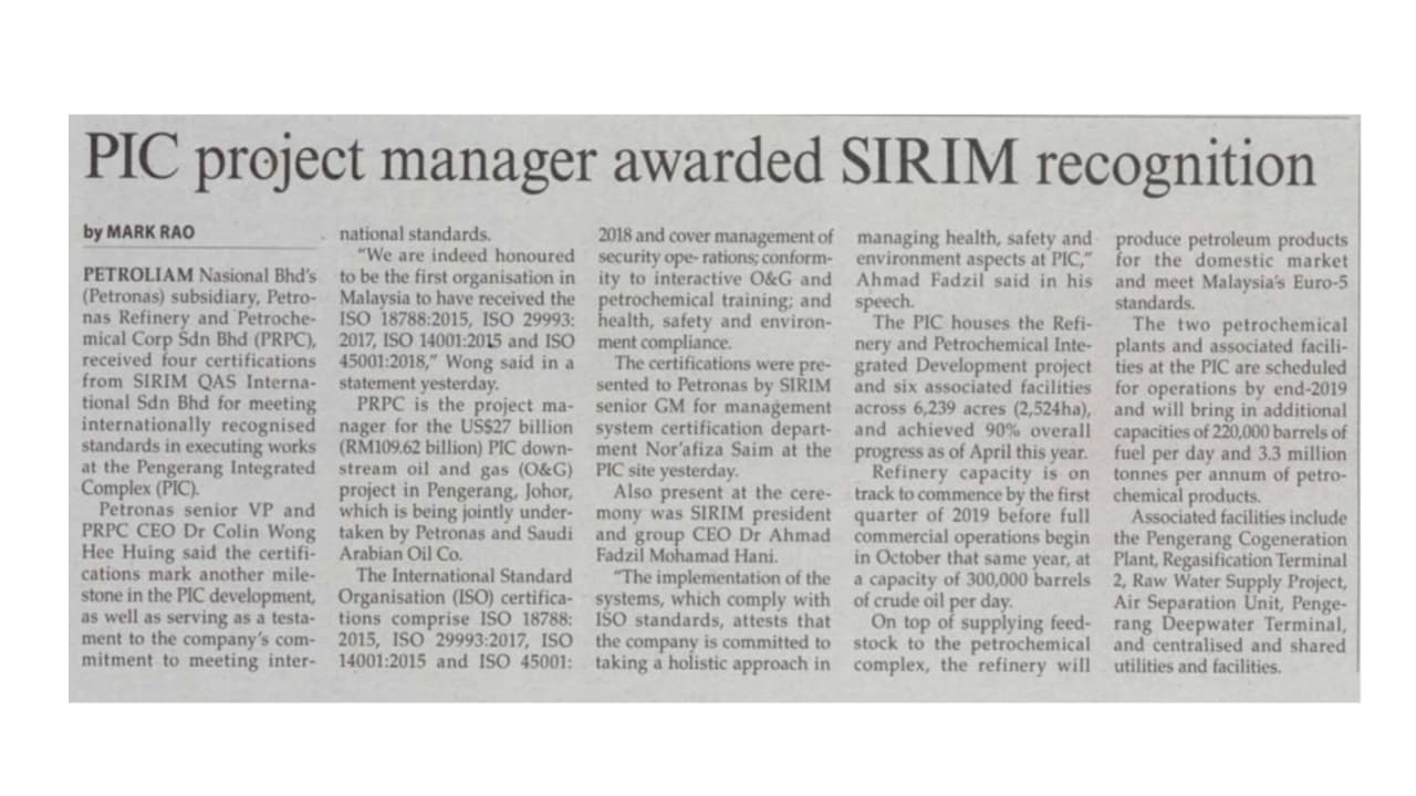 Pengerang Integrated Complex receives four ISO certifications from Sirim