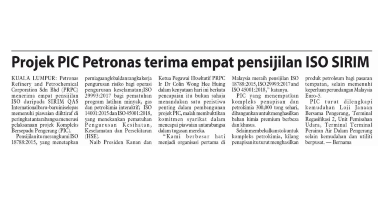 Projek PIC Petronas terima empat pensijilan ISO SIRIM