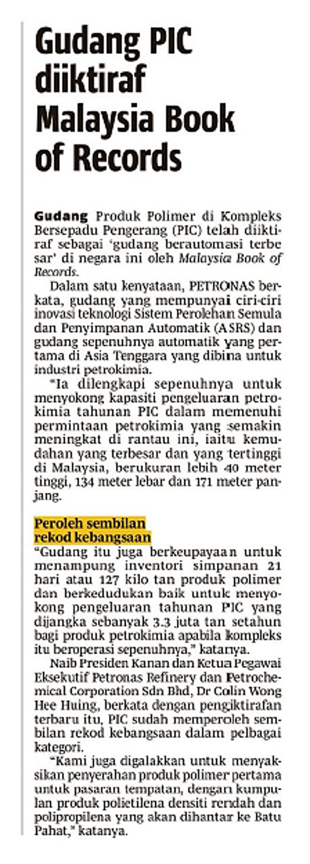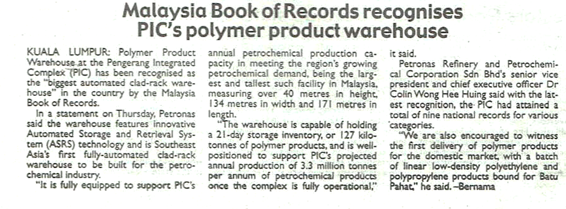 PIC's Polymer Product Warehouse Enters Malaysia Book of Records